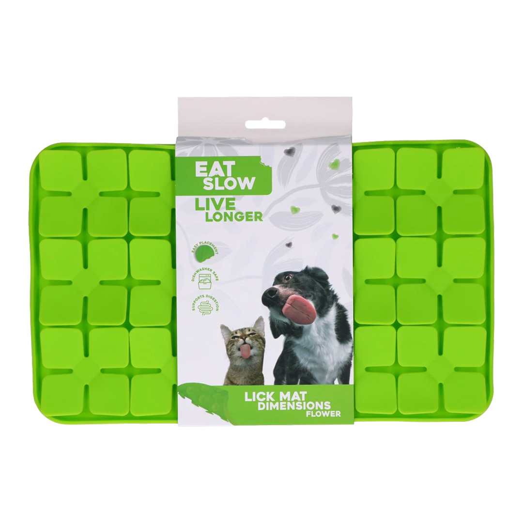 Velká výzva, skvělá zábava. Lízačka, schovávačka i zpomalovačka, prostě když chcete udělat krmení ještě zábavnější!Unikátní velká obdélníková lízací podložka posouvá zábavné a zdravé krmení na další level. Chlopně ve tvaru květin nabízí mnoho možností využití. Váš pejsek nebo kočička budou muset hledat a lízat mezi klapkami, aby snědli všechny dobroty. Lízací podložka - tato podložka je vhodná jako velmi náročná lízací podložka na pomazánky, jogurt, paštiky, konzervy apod. Hlavolam - skvěle se hodí pro zahnání nudy jako hlavolam či čmuchací podložka pro schované pamlsky. Zpomalovač krmení - stejně tak ji využijete pro zpomalení krmení, pokud mazlíčkům pod okvětní lístky naservírujete granule. Díky přísavkám ve spodní části podložku snadno připevníte na hladký povrch, takže se nebude hýbat, když ji pes nebo kočka olizuje. Přísavky skvěle drží i na svislém povrchu, třeba na vaně, skle sprchového koutu, když o pejska pečujete, nebo v kuchyni na skle trouby či na lednici, pejsek bude mít mlsnou zábavu místo žebrání u vaření.Proč lízací podložky pro psy?Mnoho psů ze stresu, nudy nebo pocitu osamění trpí nežádoucím olizováním. Olizování lízací podložky má jednak uklidňující účinek, protože se při něm u psů uvolňují endorfiny, ale také odvádí pozornost od stresující činnosti. Pomocí lízací podložky můžete pejska tohoto nežádoucího a někdy až sebedestruktivního zlozvyku krásně zbavit.Účelem lízacích podložek je také snížit hltání a následné nadýmání, snížit riziko torze (přetočení) žaludku a jiných trávicích obtíží (nadýmání), udělat z krmení zábavu a delším jedením poskytnout pejskovi větší pocit sytosti. Lízání má také velmi dobrý vliv na tvorbu slin, které pomáhají chránit zuby a dásně vašeho mazlíčka. Olizování nerovného povrchu podložky napomáhá odstranit i zbytky jídla způsobující zápach z jazyka vašeho psího kamaráda.Lízací podložky a kočky?Jasně! Žádná kočka nemá ráda, když se její vousky při krmení dotýkají strany misky. U většiny koček to vyvolává „whisker stress"(vouskový stres) a je to hlavní důvod, proč spousta koček jídlo z misky vybírá a před snědením si je pokládá kolem misky. S lízacími podložkami už vaše kočka neudělá nepořádek kolem misky a bude mnohem spokojenější! Jak lízací podložku používat? Jako lízací podložku:Podložka je ideální pro naplnění syrovým, mokrým, suchým i tekutým krmivem a zároveň skvěle poslouží i jako originální způsob, jak svému psovi dopřát oblíbené lízací dobroty, ať už jde o lahodné arašídové máslo, lízací pasty nebo třeba jogurt.Při ošetřování, koupání, fénování...:Přilepte podložku na hladký povrch (sklo, zrcadlo, hladký nábytek), ve sprchovém koutě na dlaždice, sklo nebo na vanu a potřete oblíbenou svačinou, např. paštikou, masem z konzervy, játrovou pastou nebo arašídovým máslem. Nechte pejska olizovat, zatímco se o něj staráte.Proti žebrání v kuchyni:Podložku připevněte na sklo trouby nebo na lednici či jinou hladkou plochu a potřete oblíbenou svačinou, např. paštikou, masem z konzervy, játrovou pastou nebo arašídovým máslem. Nechte pejska olizovat, zatímco vaříte. Pejsek tak bude mít postaráno o mlsnou zábavu místo žebrání u vaření.Jako zpomalovací misku:Položte lízací podložku na podlahu, pokud je podlaha dostatečně hladká, přimáčkněte jí, aby se přísavky přichytily k podlaze a podložka neklouzala. Pak naservírujte cokoliv, čím krmíte pejska. U malých granulí funguje podložka skvěle jako zpomalovací miska. REBEL TIP:Silikonové lízací podložky Eat Slow lze naplnit dobrotami krémové konzistence nebo zalít vývarem a zmrazit. Tak dopřejete svému pejskovi chutnou odměnu a příjemné ochlazení v létě!Výhody lízací podložky Eat Slow Live Longer:- zábavné krmení pro psy a kočky- uklidňuje a pomáhá vyplavovat endorfiny- u koček nezpůsobuje vouskový stres- zpomaluje jedení a působí pozitivně na trávení- vyrobená ze 100% potravinářského silikonu- má přísavky na spodní straně- snadno se přilepí na hladké povrchy- lze využít při koupání a ošetřování psa- prolisy ve tvaru včelích pláství skvěle drží potravu a dobře se vylizují- lze využít i jako zpomalovací misku pro malé psy- lze mýt v myčce- podložka je měkká, lehce jí stočíte a sbalíte na cestyVelikost: 21 x 34cmVýrobce / Značka: Eat Slow Live LongerDovozce a distributor pro ČR: Rebel Dog s.r.o.Poslední aktualizace: 2025/07