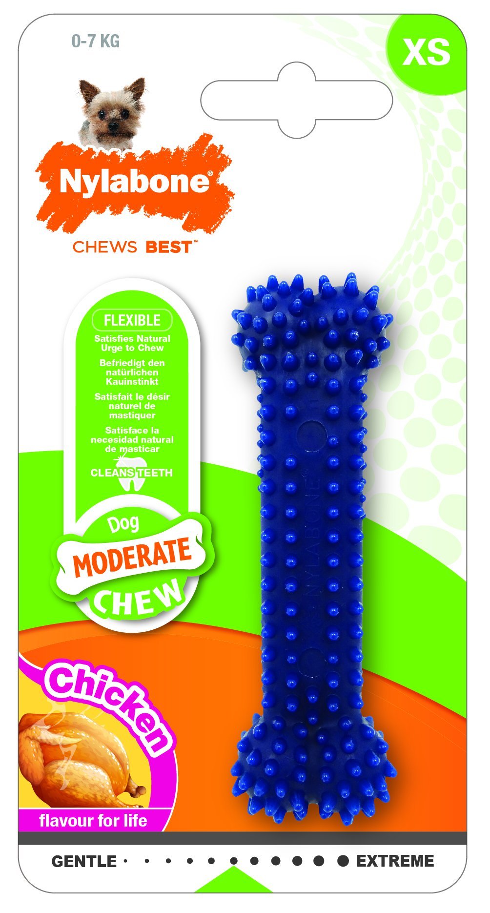 Moderate chew jsou vyráběny pro jemnější žvýkání. Uspokojuje přirozenou potřebu žvýkání. Jemné výběžky na hračce pomáhají čistit zuby a odstraňovat plak a zubní kámen. Pro náročné. Uspokojuje přirozenou potřebu žvýkání. Příchuť kuřecího masa. číst celé