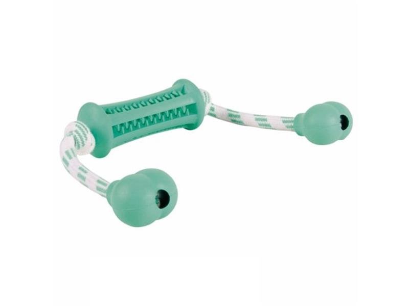 Kost s mátou TRIXIE DENTA FUN 37 cm Hračka DENTAFUN váleček Vašeho psa nejen zabaví, ale podpoří také jeho ústní hygienu. Hračka svým tvarem masíruje psovi dásně a otvory vyplněné bodlinkami odstraňují zubní plak. Navíc je váleček napušťěn extraktem z máty a osvěžuje tak dech psa. Díky gumovým zakončením lan se můžete se svým čtyřnohým kamarádem o hračku bezpečně a bezbolestně přetahovat nebo mu ji házet.
