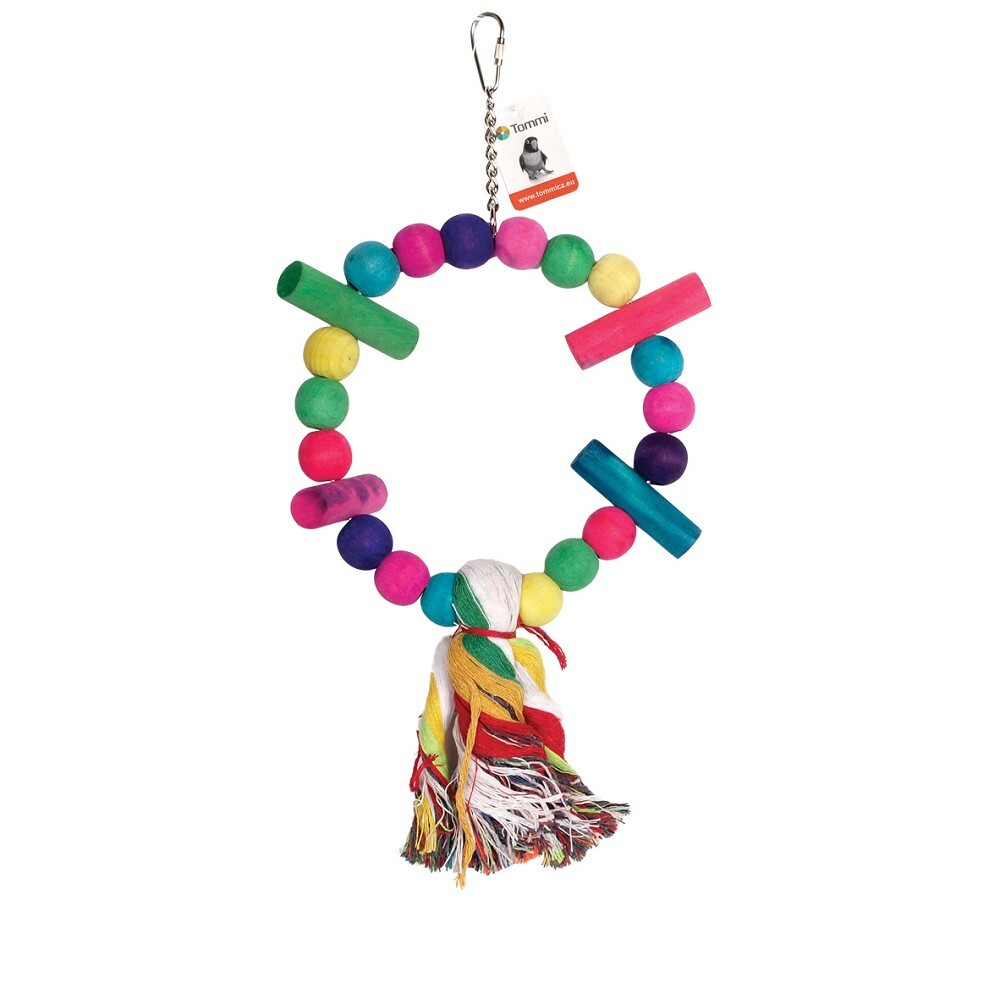 Pestrobarevná, pevná hračka s velkým bavlněným uzlem. Dřevěné části jsou barveny zdravotně nezávadnými barvami.Rozměry: cca. 20 cm (průměr)