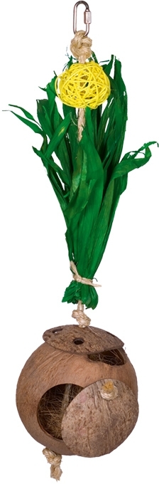 Ptáci jsou od přírody zvídaví tvorové a tuto jejich přirozenou vlastnost můžete snadno rozvíjet pomocí vhodných příslušenství do klece. Aktivní hračka od Nobby se skládá z kokosu, kokosových vláken, kukuřičných listů, proutí, sisalu a dřeva. Hračka je vhodná zejména pro papoušky a velké andulky. Snadná instalace do klece pomocí kovové karabinky. Celková velikost: 43 x 11,5 cm.