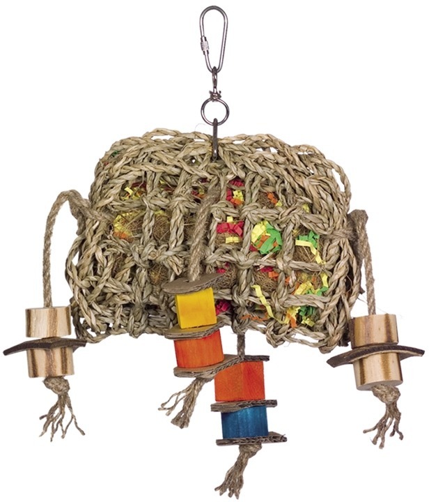 Tato hračka obsahuje spletenou mřížku z mořských řas, která je vyplněna papírem a vlákny z kokosu a sisalu, což papouškovi poskytuje různorodou texturu a zároveň možnost schovat v ni pamlsky. Hračka dále nabízí zajímavé doplňky ze dřeva, papíru, kůže a kokosu, které povzbuzují ptáky ke kousání, okusování a objevování. Díky kovové karabince je velmi snadno připevnitelná ke kleci. Celková velikost této aktivní zábavy je 29 x 21 cm, díky čemuž je hračka vhodná pro různě velké klece i druhy papoušků.