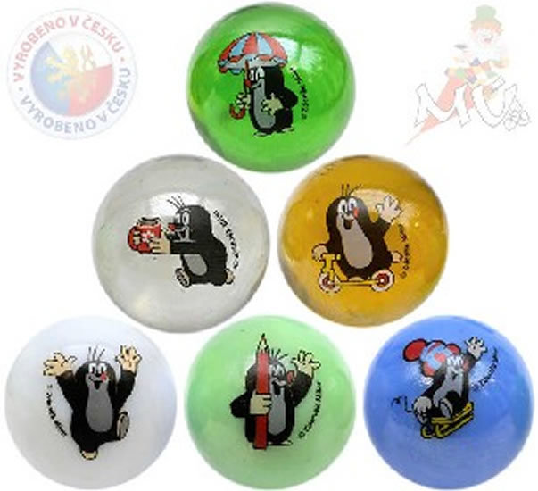 Skleněné kuličky pr.25mm s Krtečkem, balené v průhledné krabičce, sběratelské. 8 různých motivů grafiky, 6 barev skla (3× čiré + 3× matné). Nevhodné pro děti do 3 let, obsahuje malé části číst celé