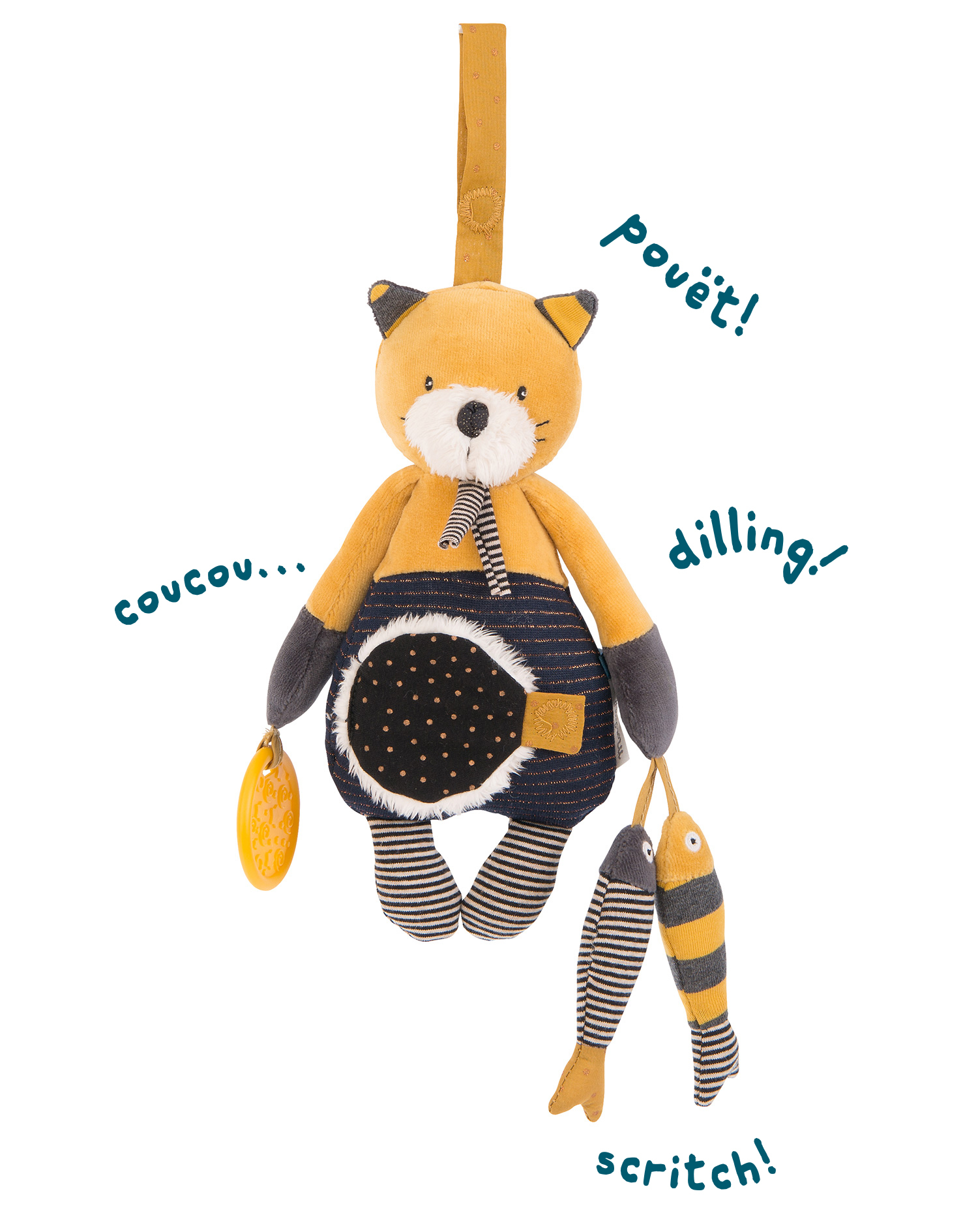 Krásná plyšová activity kočička Lulu k rozvíjení dětských smyslů, díky šustítkům, zrcátku, kousátku a chrastítku. Úchytka na přidělání ke kočárku či hrazdičce je na suchý zip. Velikost 30cm.