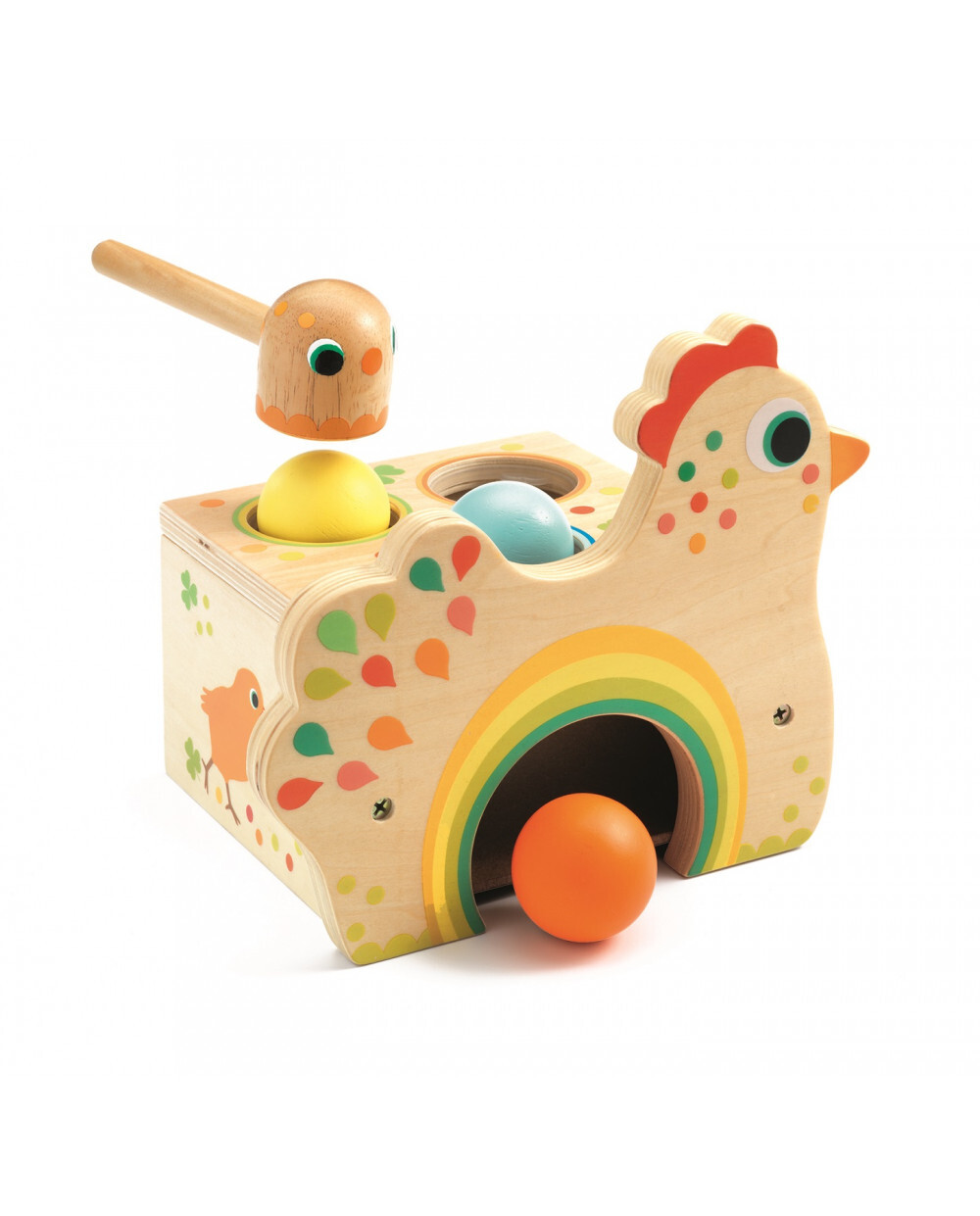 Dřevěná krásně barevná slepička s otvory pro vajíčka, která se zatloukají pomocí dřevěné paličky. Po zatlučení se vajíčko vykutálí ze slepičky. Velikost slepičky 21,7 x 18,8 x 16 cm. Vhodné pro děti od 18 měsíců. Rozměry balení: 22,5 x19,5 x 16,5 cm.