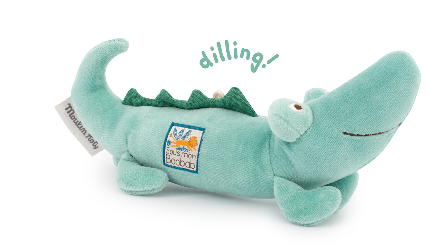 Tato zábavná hračka s chrastítkem ve tvaru krokodýla má měkké zelené tělo, velké oči a široký úsměv. V těle má zvonek, který při otřesu hračkou vydává jemný zvuk. Ideální pro první pokusy dětí o úchop. Je vhodný od narození a lze jej prát v pračce.