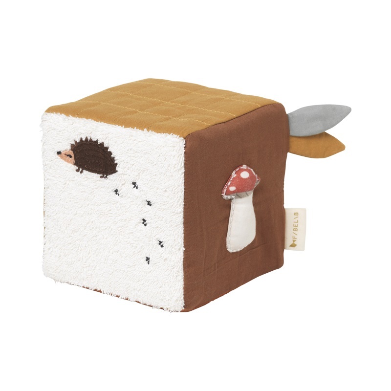 Každá strana látkové kostky má vlastní texturu. Kostku můžete připevnit na kočárek nebo dát jen tak dítěti do ručiček. Děti zabaví aktivity na kostce - šustící lístky, úchyty ve tvaru houbiček.Velikost: 12 cm. 100% organická bavlna