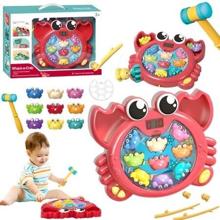 Pierwsza z tych gier to - Uderz Kraba. Duży krab jest wyposażony w elektroniczny licznik, który rejestruje każde trafienie młoteczkiem! Malutkie kraby umieszczone wewnątrz kraba zaczynają migotać kolorami - co oznacza że należy uderzać w te kraby, które się zaświecają. Punkty za każde trafienie są sumowane na liczniku, co sprawia, że gra staje się jeszcze bardziej ekscytująca. Dzieci będą się starać zdobyć jak najwięcej punktów, uderzając w migoczące kraby. To doskonały sposób na rozwijanie zręczności i refleksu.