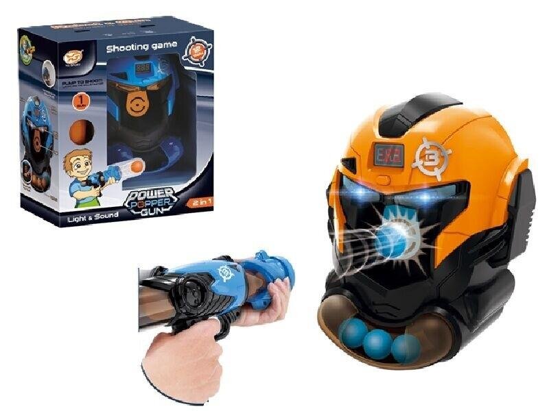 W zestawie: pistolet 18,5 cm., tarcza 22 cm., 12 piankowych kulek, funkcje: tarcza posiada licznik strzałów, po każdym trafieniu słychać dźwięk strzału i oklaski, można ją przymocować do ściany za pomocą przyssawek, świecące diody, 3+
