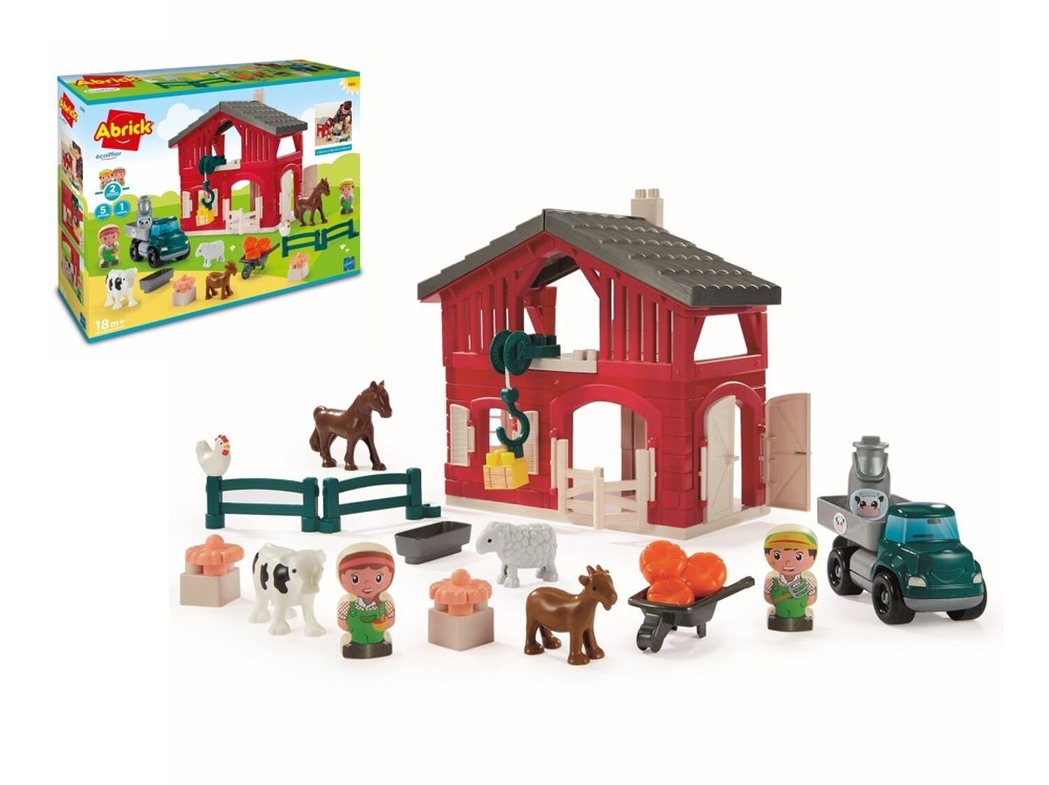 Farma z řady Abrick. Součástí 5 zvířátek, 2 figurky a 1 dopravní prostředek. Rozměry: 29,5 x 16,5 x 29,5 cm. Věk: 18M+