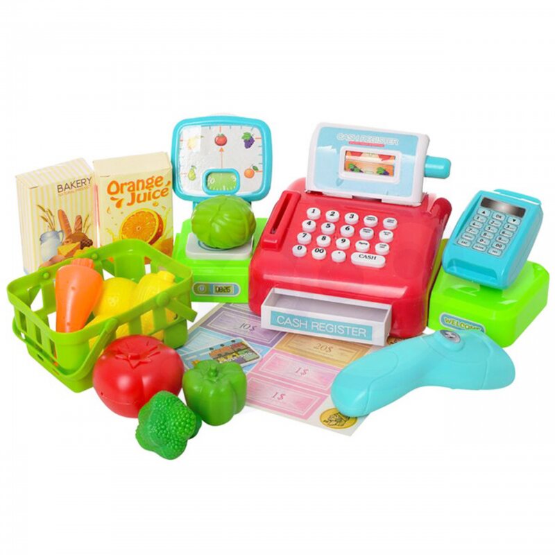 - Do zestawu dołączono: koszyk na zakupy, warzywa, owoce, kartę płatniczą, sztuczne banknoty i monety, i inne artykuły.