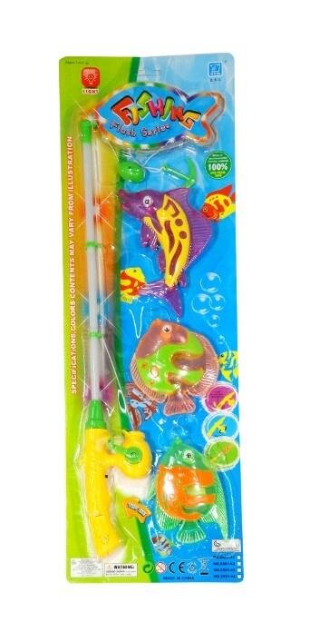 Zestaw plastikowych rybek na magnes z kolorową wędką oraz podbierakiem. Zabawka przeznaczona dla dzieci powyżej 3 roku życia. Produkt zapakowany w kartonową podstawkę z przezroczystym kloszem.