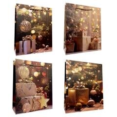 Świąteczna torebka prezentowa wykonana z trwałego papieru, utrzymana w klasycznej, eleganckiej stylistyce. Idealna do zapakowania prezentów pod choinkę, nadaje upominkom wyjątkowy, odświętny charakter. Wyposażona w mocne uchwyty i staranne wykończenie, łączy estetykę z praktycznością.