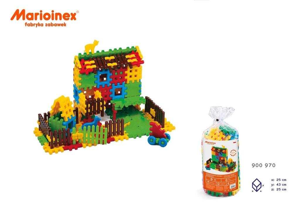 Zestaw klocków konstrukcyjnych \'gospodarstwo domowe\' składający się ze 120 elementów. Opakowanie: worek foliowy zamykany zatrzaskiem.