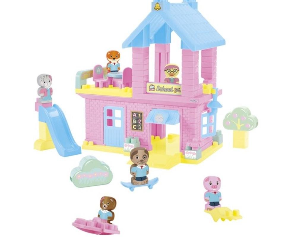 Piętrowa, pastelowa szkoła z mnóstwem miejsca do zabawy, w tym zjeżdżalnia karuzela, huśtawka, taras ze stolikiem i krzesełkami. Zestaw zawiera 6 figurek, Wymiary: 33,5x30x35,5 cm, 18m+ číst celé