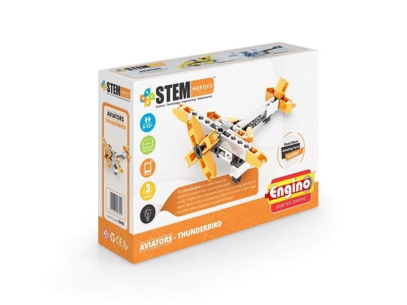 Zestawy klocków STEM Heroes, seria Awiacja, umożliwiające zbudowanie 1 modelu z każdego zestawu, ulotka informacyjna dotycząca tematyki danego zestawu, bezpłatna aplikacja do ściągnięcia z Internetu. Zestawy łączą się, po zebraniu trzech zestawów można zbudować model combo\'.