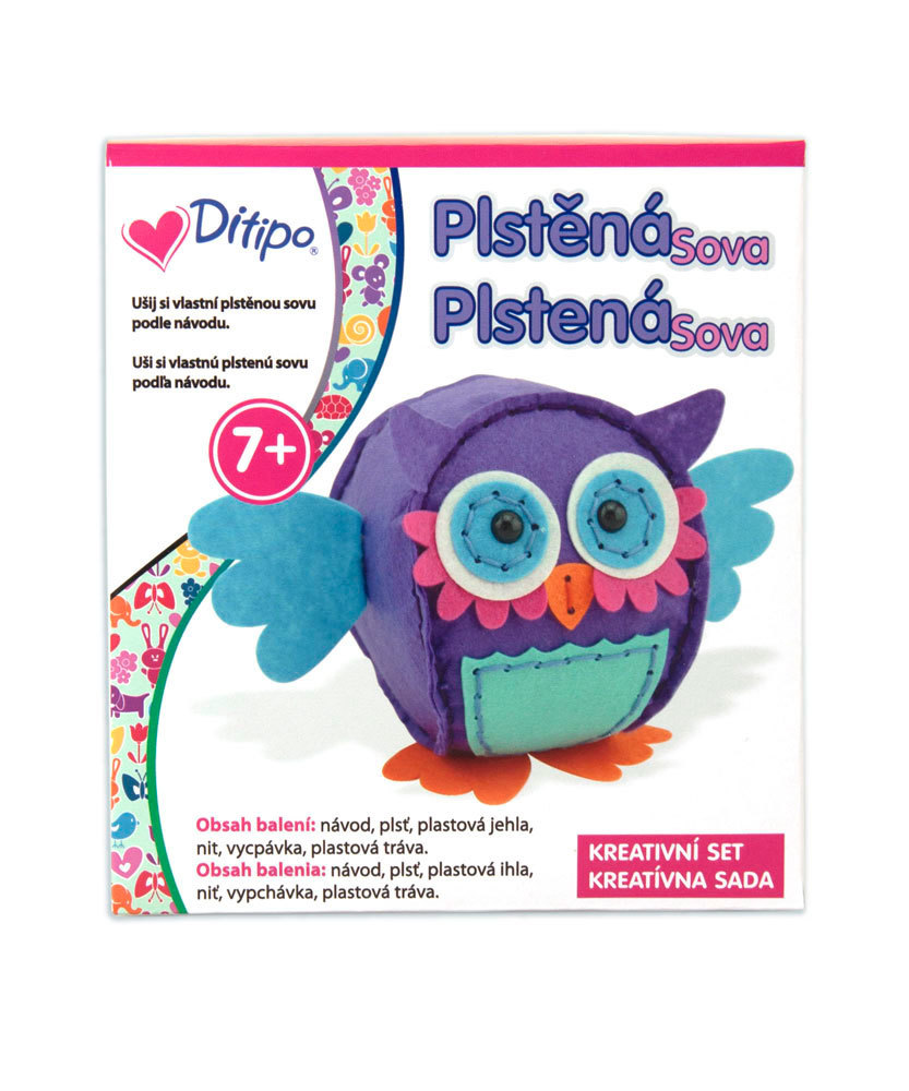 Sešitím jednotlivých plstěných částí podle vyznačených dírek vznikne hezká sovička. Kreativní set obsahuje návod, vyseknuté díly, plastovou jehlu, nit, vycpávku a plastové oči.Věk: 7+
