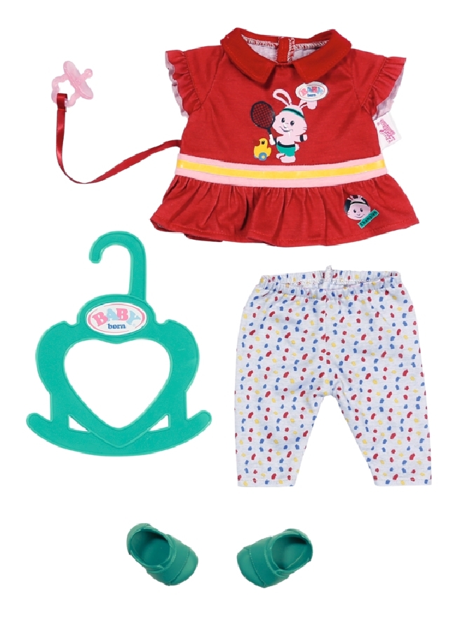 • Roztomilá souprava s veselým potiskem. • Šatičky s našitým dudlíkem. • Legíny. • Soupravu skvěle doplňují barevně sladěné botičky. • Součástí je ramínko. • Doplňky na hraní pro děti od 2 let. • Pro panenky velikosti 36 cm. • Možno prát v ruce ve vlažné vodě. Nesušit v sušičce. • Balení: papírová karta s ramínkem na zavěšení.