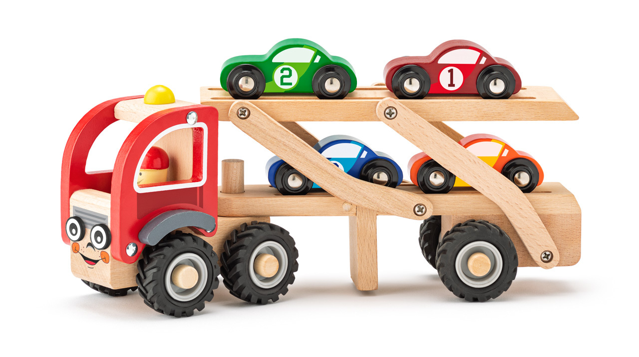 Tahač, návěs i auta jsou vyrobeny z tvrdého masivního dřeva. Patrová plošina pro auta se dá sklopit tak, aby auta mohla najet a zase sjet z rampy. Tahač a návěs se dají odpojit. Balení obsahuje: tahač, návěs a 4 auta. Rozměr: 27 x 8 x 11 cm. Věk: 3+