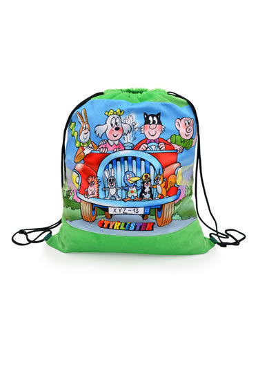 Lehký látkový pytlík s motivem komiksového Čtyřlístku, který šňůrkami stáhnete a můžete ho nosit na zádech jako batůžek. Rozměr 40x33cm. Objem cca 6 litrů. Nosnost 3 kg. Pratelný. Vyrobeno v ČR.