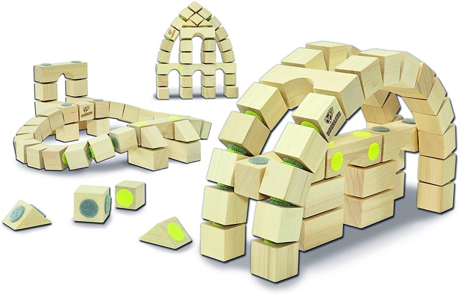 Dřevěná 3D kreativní stavebnice Docklets Stavby 32x32 cm, 42 dílů, lze postavit 3 druhy staveb, Docklets je nový systém stavebních bloků pro malé i velké stavitele! Jeho revoluční systém ukotvení vám umožňuje stavět jednoduché nebo složité trojrozměrné modely, které by s konvenčními bloky nebyly možné. Spojovací kolečka jsou barevně odlišena pro intuitivní použití. Zajišťují určitou flexibilitu mezi bloky, což umoňuje ergonomické tvary. Ilustrované podrobné pokyny pomáhají dětem vymyslet mnoho nápadů, jak s