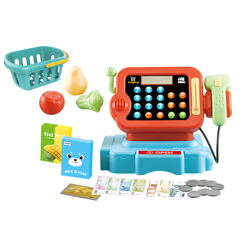 Moderní pokladna se čtečkou čárových kódů, která naskenuje obsah celého košíku. Součástí pokladny je i platební karta a samozřejmě také dětské peníze. Košík obsahuje výběr základních potravin. Pokladna funguje na 2 x 1.5V AA baterie, které nejsou součástí balení.