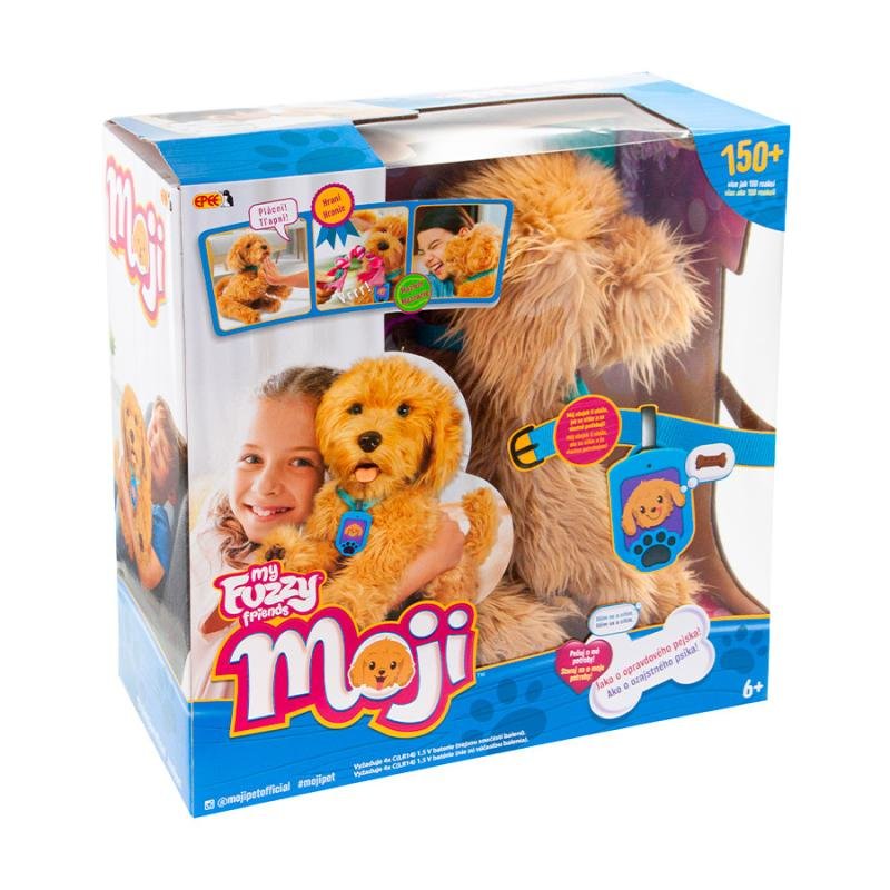 Interaktivní pejsek Moji je mazlivé štěňátko, které má hebkou srst a roztomilý výraz. Reaguje jako skutečný pejsek na hlasové povely a dotek více než 150 unikátními reakcemi. Můžete ho naučit 10 psích triků a užít si s ním spoustu zábavy. Kolem krku má navíc speciální chytrý obojek s displejem, na kterém se zobrazují jeho potřeby a nálady. Na ty je možné vedle hlasových povelů a dotyku reagovat také pomocí speciálních kartiček „péče“ a zajistit tak, aby měl Moji vše co potřebuje. Součástí balení jsou 3 nezbytné psí doplňky - miska, kartáč na srst a uzel na přetahování. Baterie: 4xLR44, nejsou součástí balení. Pro děti od 6 let.