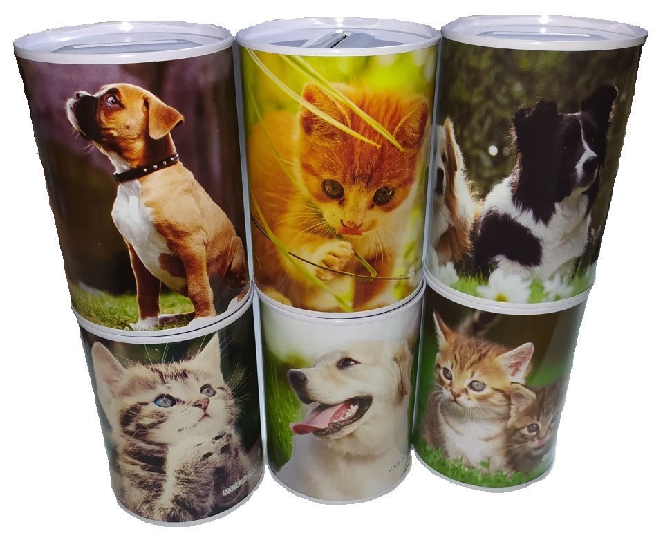 Pokladnička plechová s motivem zvířat (kočky, psi), 6 druhů, 7,5 x 10 cm. Nelze vybrat druh, dodáváme dle skladové dostupnosti.
