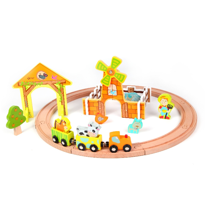Postav si vláčkodráhu a můžeš ve vláčku vozit zvířátka ze statku. Dřevěná vláčkodráha pro všechny malé milovníky vláčků a zvířátek. Sada obsahuje koleje, mašinku se dvěma vagónky, zvířátka a další doplňky. Pozor! Tato hračka obsahuje magnety nebo magnetické části. Magnety přitahující se k sobě navzájem nebo ke kovovému předmětu uvnitř lidského těla mohou způsobit vážné zranění. V případě spolknutí či vdechnutí magnetů vyhledejte okamžitou lékařskou pomoc.