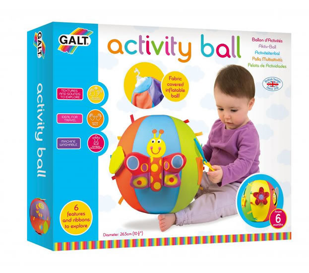 Velké látkový nafukovací míč plný aktivit pro děti Na míči je připevněno 6 druhů aktivit pro děti a barevné pásy po stranách.