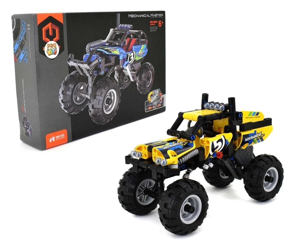 Klocki auto terenowe to konstrukcja dla bystrych konstruktorów. Po złożeniu 199 elementów dziecko otrzyma samochód terenowy z napędem pull-back.