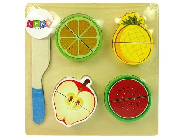 Owoce przyczepione są do siebie rzepami, dlatego łatwo można je pokroić, a potem złączyć je razem. Dopasowywanie odpowiednich połówek zwiększy umiejętności logicznego myślenia. Aby dziecko mogło przygotować owoce, deseczka do krojenia pozwoli przekroić je na połówki, dołączonym do zestawu nożykiem. Wgłębienia w deseczce nauczą dziecko dopasowywać odpowiednio kształty oraz rozwiną wyobraźnię przestrzenną.