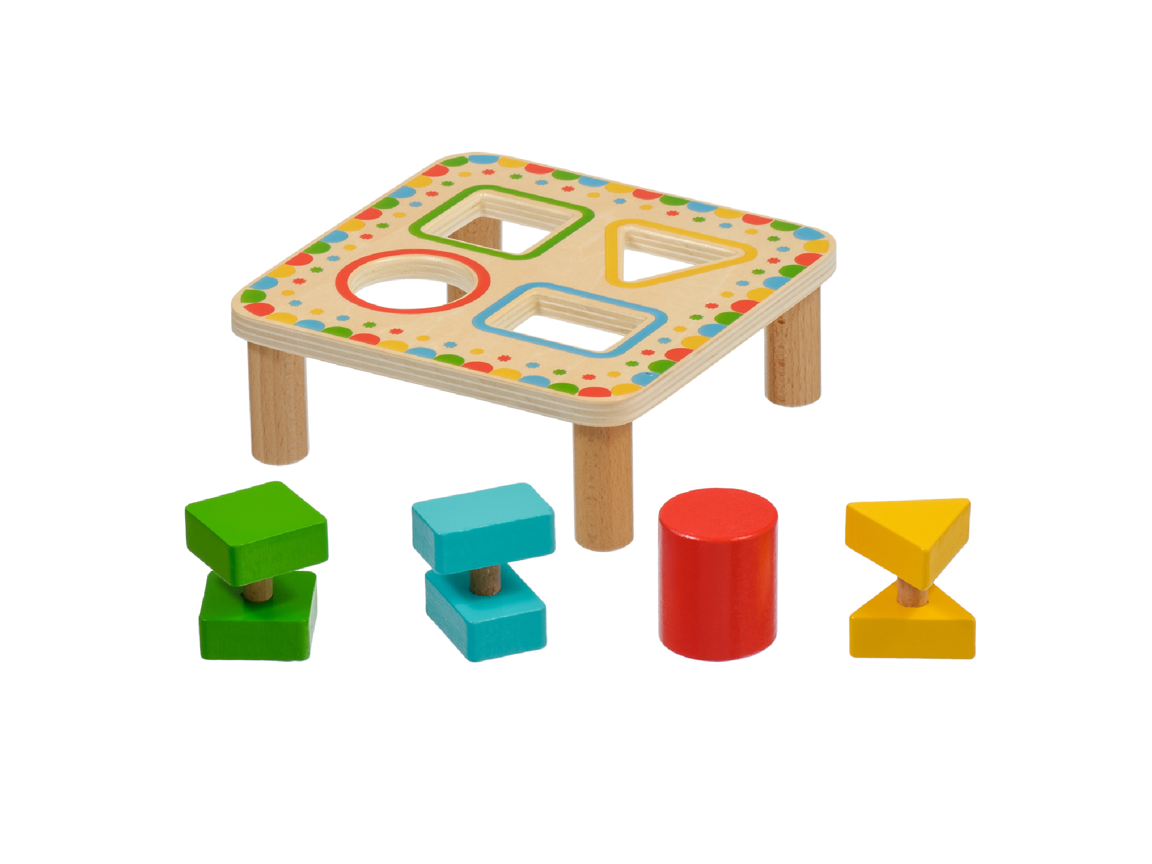 Třídění geometrických tvarů není jen běžná dřevěná vkládačka, která učí děti poznávat základní geometrické tvary a barvy. Hra má totiž tři důmyslné dvoudílné vkládací prvky. Dítě tedy bude muset nejprve tyto prvky roztřídit a přiřadit k odpovídajícím otvorům a následně najít způsob, jak je skrz vybrané otvory prostrčit. Dvoudílné prvky je totiž třeba při průchodu deskou po prvním vsunutí správně pootočit, aby prošel skrz otvor celý vkládací prvek. Tato činnost bude vyžadovat u dětí více logického myšlení a