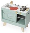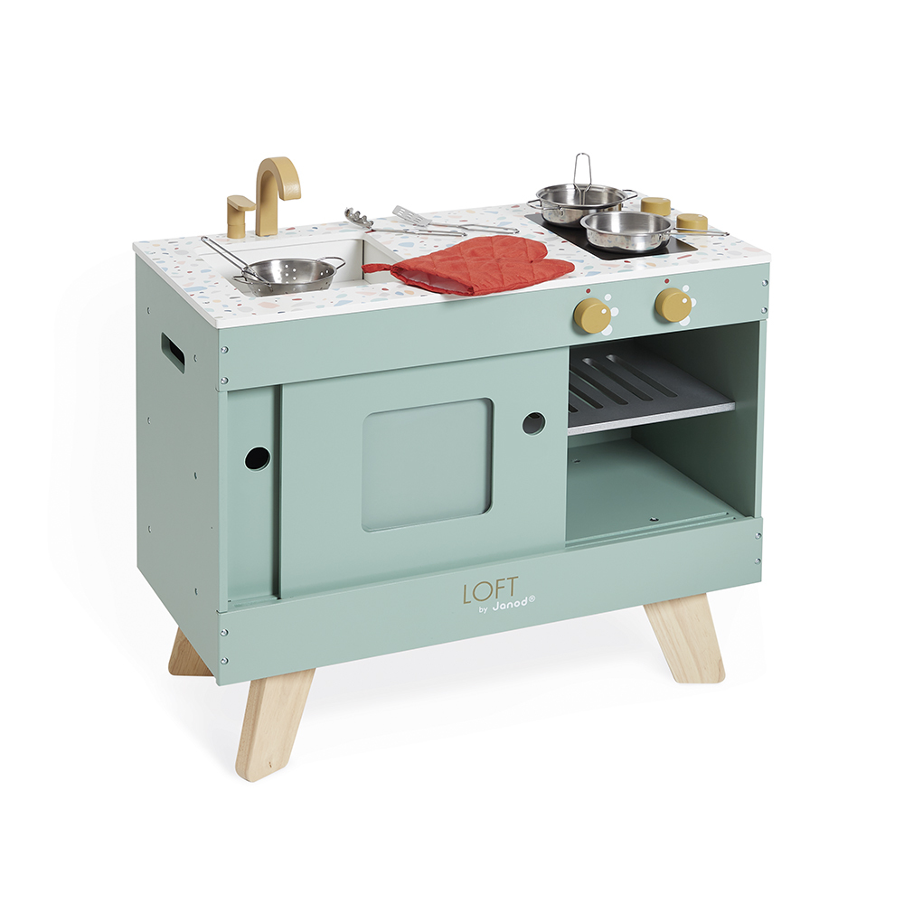 Malý dřevěný menthol-bílý kuchyňský loft Janod je skvělý kuchyňský kout s otočnými knoflíky a nadčasovým designem. Postavenou část kuchyně jsou dřez, vaření dvojitého, trouby a skříně s posuvnými dveřmi. Spolu s kuchyní najdete také 8 příslušenství v balíčku: hrnec, pánev, síto, naběračka, otáčení, další dva těstoviny a puska. Pečení trouba je realistický příslušenství, které bude ocenit každý kuchař. x000d Dřevěná kuchyně má dvě otočná knoflíky, která vydávají zvuk, a tak se děti cítí jako skutečná kuchyň. Dřevěná kuchyně pro děti v krásné barvě mentolu je skvělým doplňkem každého dětského pokoje. Malí kuchaři mohou vařit večeři na varné desce, péct dort v troubě, vložit nádobí do vestavěné skříně a naučit se, jak udržovat pořádek. Na straně kuchyně je díra, díky které je možné snadno přenést kuchyň, při pohledu na velikost kuchyně v místnosti nezabírá mnoho místa. Dítě rozvíjí svou kreativitu a představivost vymýšlením nových a nových receptů.x000d Vhodné pro děti od 3 let.