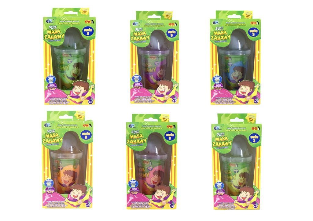 Užijte si bezva zábavu s tím slizem. Díky originální švýcarské receptuře je sliz bezpečný a zdravotně nezávadný. Má příjemný zápach a konzistenci, která vám umožní spoustu zábavy. Můžete ho natahovat, roztahovat do tenké blány, mačkat nebo vytvářet legrační prdivé zvuky. Pokud do něj vložíte kuličku, která je součástí balení, začne kulička blikat a vydávat zvuky. Vyžaduje 2 × 1.5V LR41 baterie, jsou součástí balení. Vhodné pro děti od tří let.
