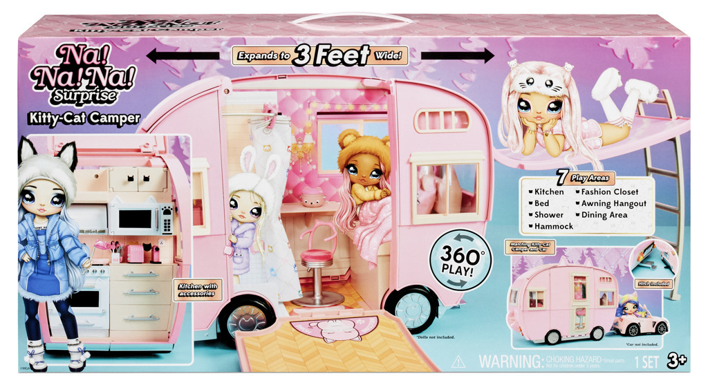 "Na! Na! Na! Surprise Panenky i Teenagerky mohou vyrazit na cesty v útulném pohyblivém růžovém karavanu s kočičími detaily. Vysuň horní, přední a boční panel a Karavan rozložíš na 7 hracích ploch jako je kuchyň s mikrovlnkou a troubou, houpací síť, postel, stolička, sprcha, šatník a další. Karavan má funkční okna, zásuvky a mnoho měkkých doplňků s kočičími detaily. Karavan můžeš zapojit za Na! Na! Na! Stylový kabriolet.