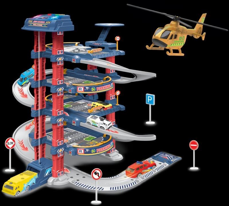 Garáž město. Obsahuje :garáž,letadlo s otevírací částí trupu, 3x kovovoýmodel autíčka (měnící barvu),plán města,samolepky baterie 3x 1,5V AA nejsou součástí balení