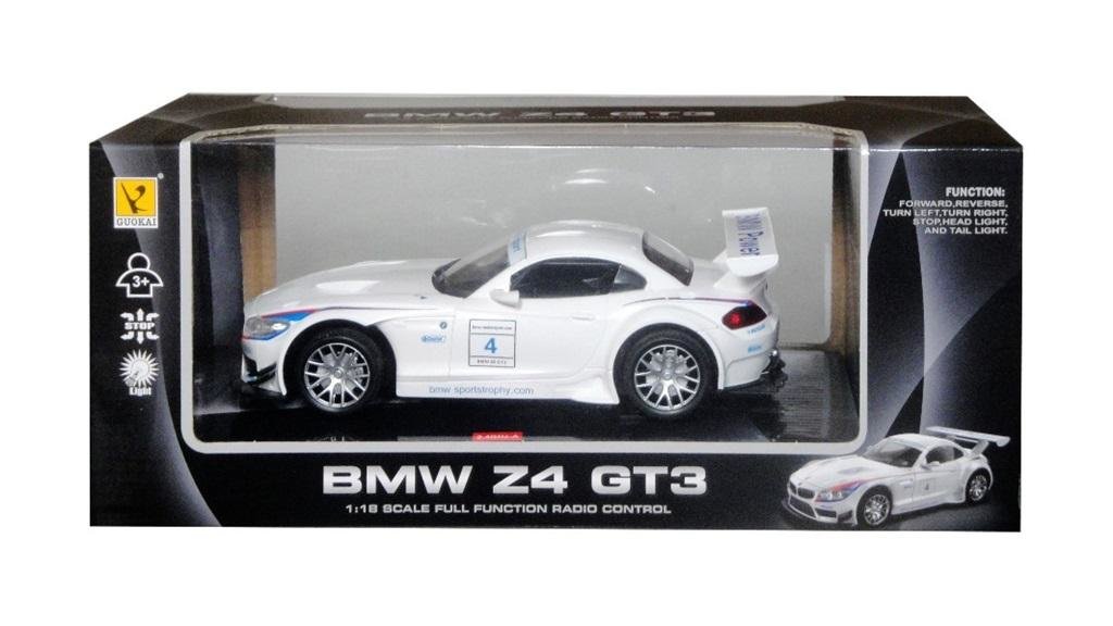 Samochód BMW Z4 GT3 sportowe sterowane pilotem. Porusza się we wszystkich kierunkach (skręca w lewo i prawo, jedzie do przodu i do tyłu), świeci. Zabawka dla dzieci od 3 lat. Podane wymiary stanowią wymiar opakowania. Zabawka działa na baterie typu AA.