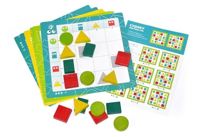 W zestawie: 10 dwustronnych kart z zadaniami, 16 drewnianych elementów.