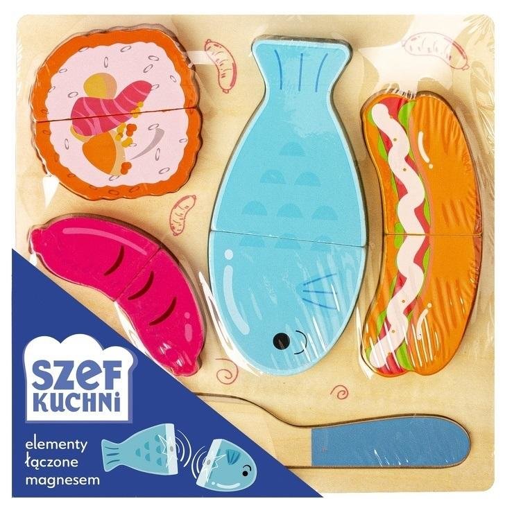 Zestaw "Szef kuchni" rozwija wyobraźnię, kreatywność oraz motorykę dziecka. Zabawa zestawem daje możliwość poznania owoców, warzyw i przekąsek, zachęca do gotowania oraz nauki o zdrowym odżywianiu. Wszystkie elementy wykonane są z drewna, pokryte bezpieczną dla dzieci farbą. Elementy...