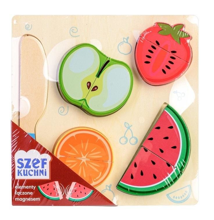 Zestaw "Szef kuchni" rozwija wyobraźnię, kreatywność oraz motorykę dziecka. Zabawa zestawem daje możliwość poznania owoców, warzyw i przekąsek, zachęca do gotowania oraz nauki o zdrowym odżywianiu. Wszystkie elementy wykonane są z drewna, pokryte bezpieczną dla dzieci farbą. Elementy...