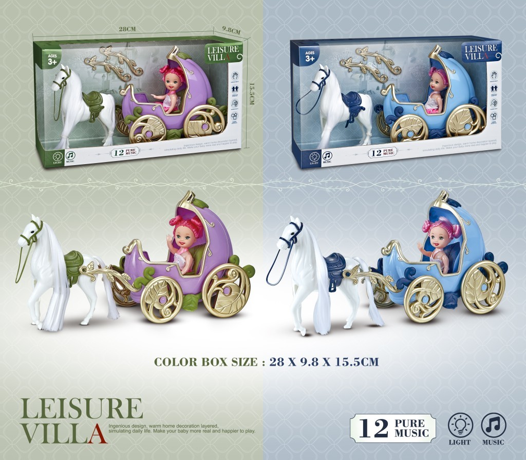 Hrací set obsahuje panenku, koníka a kočár. číst celé