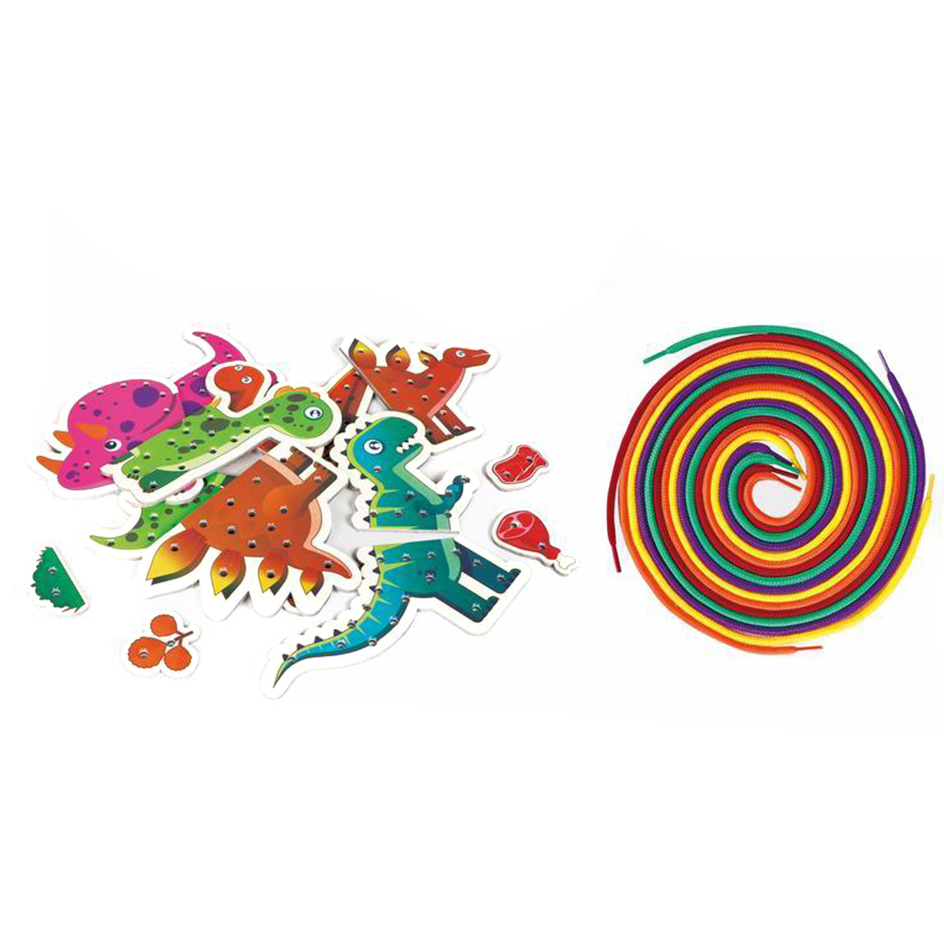 Díky sadě pěti různých obrázků s motivy dinosaurů a pěti barevným tkaničkám si děti mohou snadno a hravě provlékat jednotlivé části a vytvářet tak originální kompozice. Tento produkt stimuluje kreativitou, učí děti soustředění a poskytuje jim příležitost vytvářet vlastní vzory a kombinace barev.