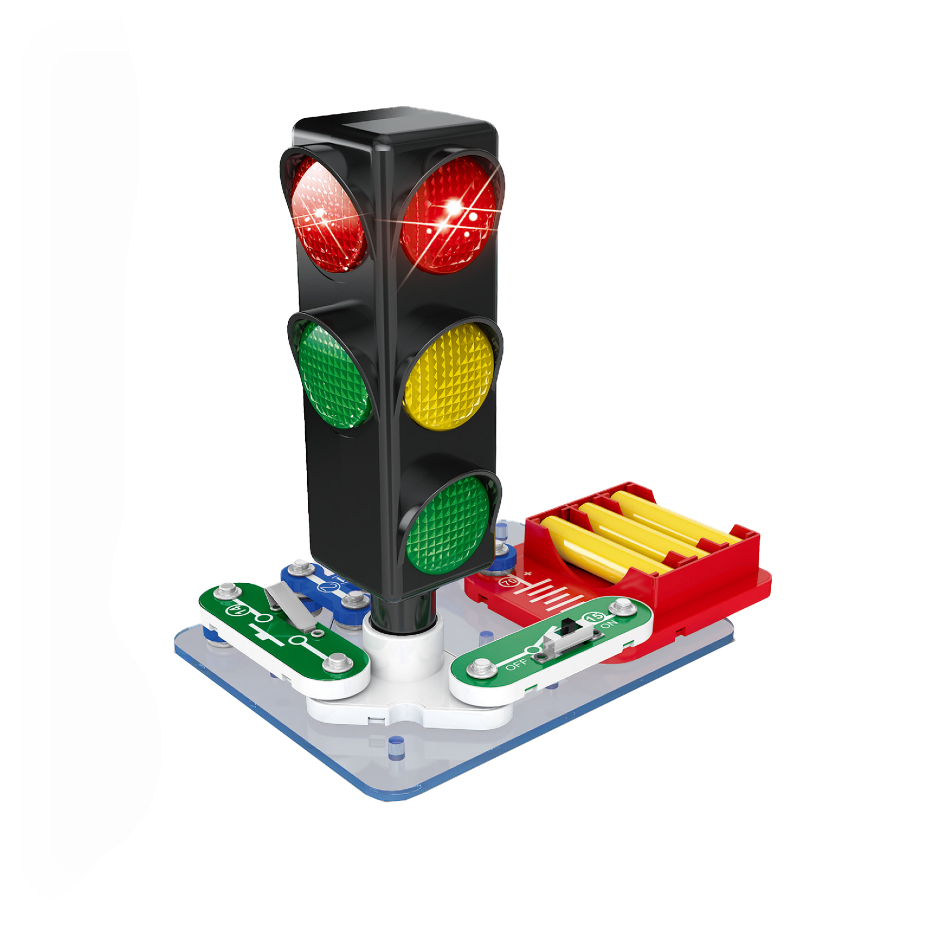 Tento semafor obsahuje všechny potřebné komponenty pro jednoduché sestavení a zapojení světelných signálů, které známe z reálného světa. Naučit se pracovat se zapojením je snadné a díky jasným kontaktům na součástkách máte vše pod kontrolou. Stačí přidat 3 kusy baterií typu AA (není součástí balení) a váš semafor začne svítit a fungovat jako opravdový dopravní světelný signál.