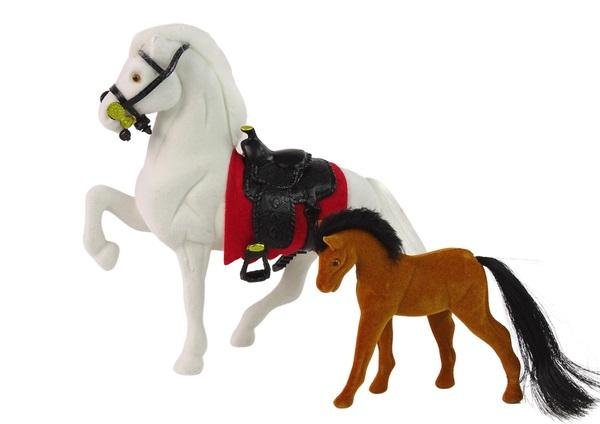 Zestaw zawiera dwie figurki dorosłego białego konia i małego brązowego źrebięcia. Miłe w dotyku konie świetnie sprawdzą się jako dopełnienie kolekcji oraz wesołą zabawę. Długi ogon i grzywa jest idealna do czesania i zaplatania warkoczy przez co Twoje dziecko pracuje nad zdolnościami manualnymi.