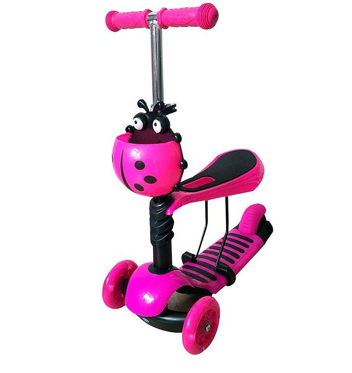 Bezpečnost je maximálně zajištěná díky stabilní konstrukci, protiskluzové úpravě stupátka i řídítek a zadní nášlapné brzdě, která zároveň funguje jako praktický blatník. Svítící LED kola dodávají koloběžce atraktivní vzhled a zvyšují viditelnost za horších světelných podmínek. Roztomilý košíček ve tvaru berušky je praktický i stylový doplněk pro uložení oblíbených drobností na každé vyjížďce.