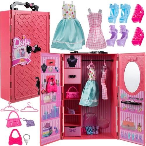 ŠATNÍ SKŘÍŇ PRO PANENKY + OBLEČENÍ, BOTY A TAŠKYPro malé modní stylisty - malý stylista může míchat styly a kombinovat oblečení a doplňky, aby vytvořil pokaždé nový vzhled pro panenku. Elegantní šaty a módní střihy. Skvěle se budou hodit na posezení s přáteli na kávu nebo bláznivý večírek.Příslušenství v ceně - dvoje šaty zavěšené na ramínkách, tři páry bot, náhrdelník a tři kabelky dokážou během mrknutí oka změnit celou stylizaci. Zábava a móda v jednom.Skříň je růžová v kombinaci s klasickou černou, díky čemuž celek působí velmi stylově a jistě osloví i malou elegantní slečnu. Dveře se otevírají jednoduše.Jednoduché na přenos - určená pro zábavu doma i na cestách, přenosná šatní skříň s madlem je vybavena oblečením a doplňky, které poskytnou spoustu potěšení z vytváření originálních stylů. Trendy kousky lze pokaždé míchat a sladit pro jedinečný vzhled. Dva věšáky vám pomohou udržet pořádek a četné police jsou skvělým místem pro uložení příslušenství.