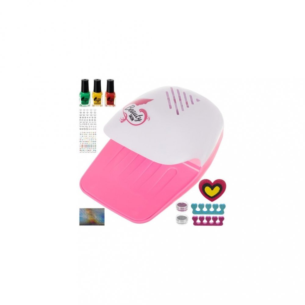 Sada obsahuje: vysoušeč nehtů s ventilátorem pro urychlení schnutí nehtů, napájení na baterie, ozdobné kamínky na nehty, 3 laky, oddělovače na nohy, 2 třpytky v různých barvách a pilník ve tvaru srdce. Vše je zabaleno v barevném obalu ideální jako dárek.