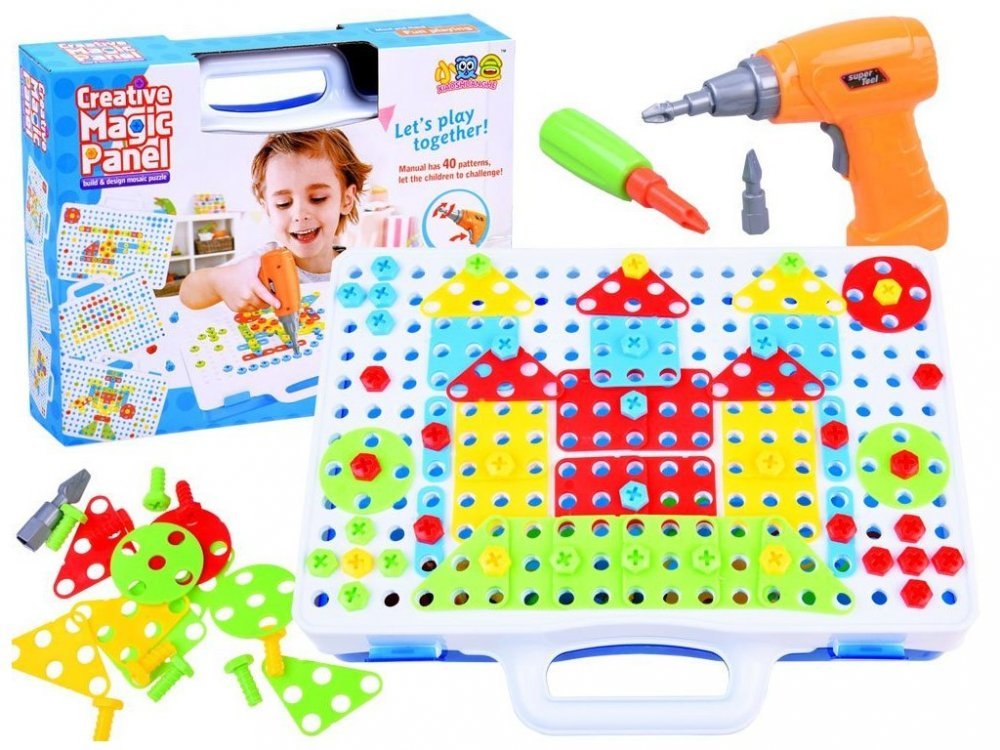 - šroubovák (napájený 2 bateriemi AA - 2 x 1,5 V - není součástí balení)- dva výměnné bity šroubováků- hvězdička šroubováku- barevné šrouby- barevné podložky- brožura s nápady- panel kufru s otvory (30 cm x 24 cm)
