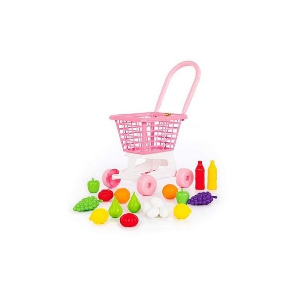 Nákupní vozík Supermarket č.1 růžový + Sada potravin . Baleno v síťce, rozměry: 365x310x240 mm /+3